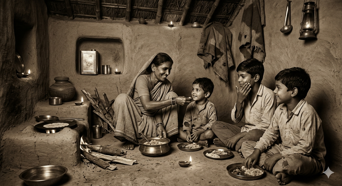 त्योहारों का मतलब आज के बच्चों के लिए नए कपड़े और पटाखे हैं, लेकिन हमारे लिए त्योहार का मतलब था ‘पेट भरकर रोटी’। एक दीपावली की रात, पूरे गाँव में दियों की रोशनी थी और पकवानों की खुशबू। लेकिन हमारे घर में घी का एक डिब्बा तक खाली पड़ा था। माँ की आँखों में नमी थी, पर उन्होंने हार नहीं मानी। उन्होंने सूखी रोटियों को अपने हाथों से चूरा, उसमें थोड़ा सा गुड़ मिलाया और बिना घी के ही ‘चूरमा’ तैयार कर दिया।